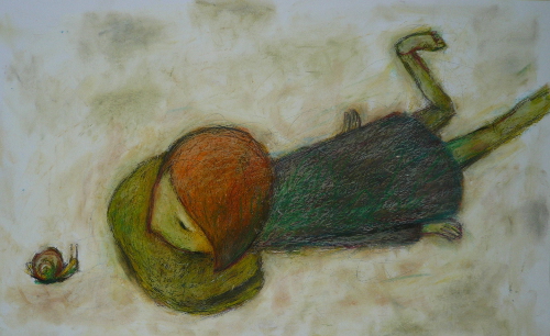昼なのか夜なのか判然としない画面の中には永遠の、極めてゆっくりとした時間が流れているようです。幼い頃に見たお気に入りの絵本の主人公とお喋りしているような気持ちにさせてくれます。