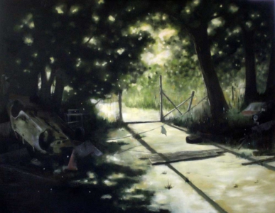 岩月の絵画には、さびれた路地や、打ち捨てられ、草木と一体化したような車であったりと、どこか侘しさの漂うモチーフが必ず描かれています。美しさとは日常と切り離されたどこか特別な場所にあるのではなく、私たちの日々見慣れた風景や生活の中にあるという信条を胸に、岩月はキャンバスへ向かいます。