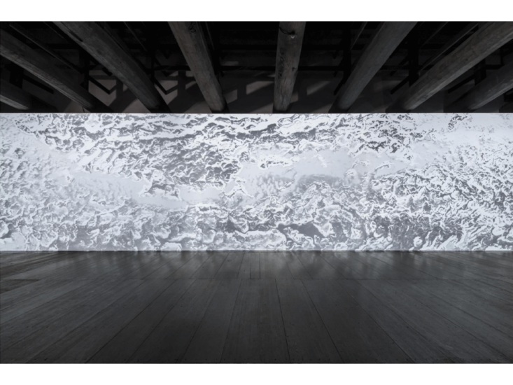 一面に広がる仮想ランドスケープの上を、異なる特性を持つ流体が蠢き合い反応変化し続ける映像インスタレーション「Tornscape」(2019年〜)。気象や物理データをもとに、風の強さ、粒子の質量や摩擦係数などパラメータを調整したデジタルシミュレーションが、無数の粒子の運動となって現れています。いくつもの流体が互いに接触し、反応し、蠢くイメージは、独自のアルゴリズムによって生成され、決して同じパターンを繰り返すことはありません。災害と疫病に見舞われた800年前の随筆(鴨長明『方丈記』)を参照しながら、本作は生まれては消える泡のように無常な世界を描き出し、今日の時代に共鳴しています。