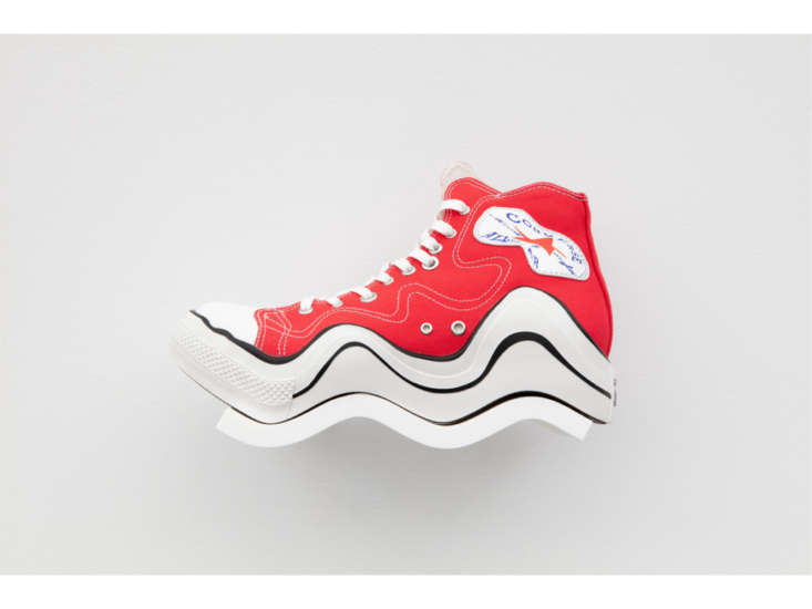 本展では、2022年にNYのペロタンにて発表されたCelebrity iPhones シリーズとWavy Sneakersシリーズと称された作品を展示します。Celebrity iPhonesは、セレブリティたちの電話番号を実際に登録したiPhoneを作品化したものです。メディアを中心にノンストップで引き起こされている群集心理的欲望と個人情報保護というアンビバレントな綱引きを暗に提示した作品です。また、Wavy Sneakersは、さまざまなブランドのスニーカーが、波の形状にデフォルメされた作品です。本シリーズは、商標登録によって権利が担保されているブランドロゴやデザインが、こうして歪められて別の形態を持った時、果たしてどこまで有効なのかという、悪戯めいた批評性を帯びています。