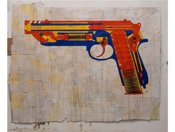 今展では、8×10インチ(20.3×25.4cm)サイズのブライアンの鮮やかなピンク色を背景にしたポップな作品と、アルフレッドのカラフルな銃シリーズの作品を一直線に壁に展示します。
