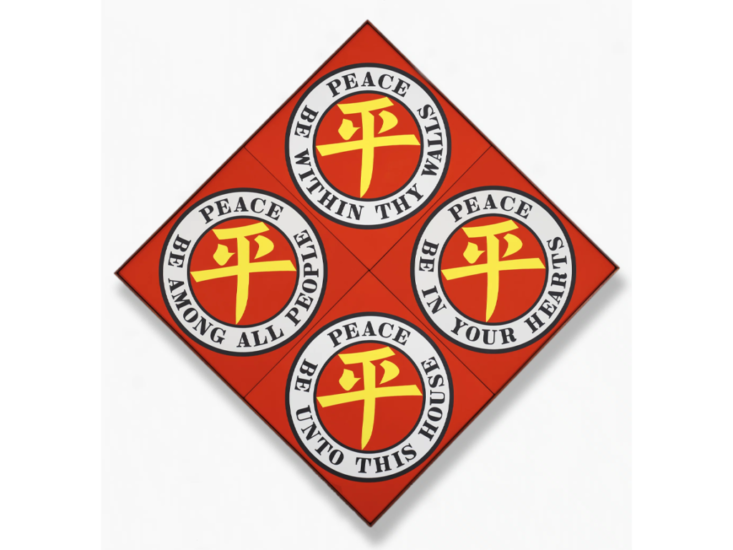 Paintings created by Indiana between the 1960s and early 2000s will also feature in Pace’s presentation in Hong Kong. Among these works is one of the first LOVE paintings, a small-scale, 12 x 12 inch work from 1965. Several paintings in the exhibition will have unique resonances in Hong Kong: Ginkgo (2000), a hard-edge composition depicting a ginkgo leaf design that Indiana, inspired by the leaves on the trees he saw around the Coenties Slip, began exploring in 1957, and Four Diamond Ping (2003), a dynamic, diamond-shaped work containing the Mandarin word for “peace” as well as biblical phrases in English.